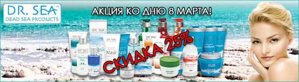 Специально к женскому дню, Dr.Sea предоставляет скидку 25% на несколько линеек* своей продукции. Сроки акции: с 3 марта по 8 марта. Не упустите возможность приобрести отличную продукцию еще дешевле.
